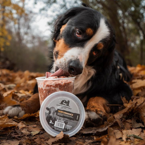 Poulet haché (viande et os), abats de bœuf (foie, rein, rate, cœur), tripes de bœuf vertes.
